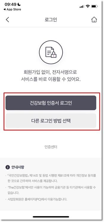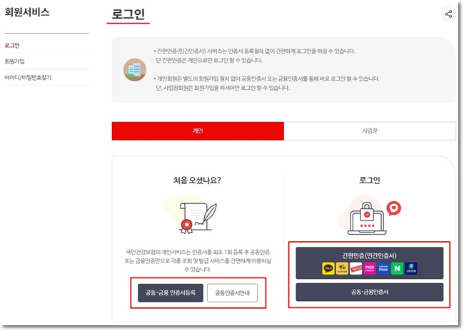 공동인증서, 금융인증서 등 여러가지 인증방법 중 하나를 선택하여 인증 후 로그인 합니다.