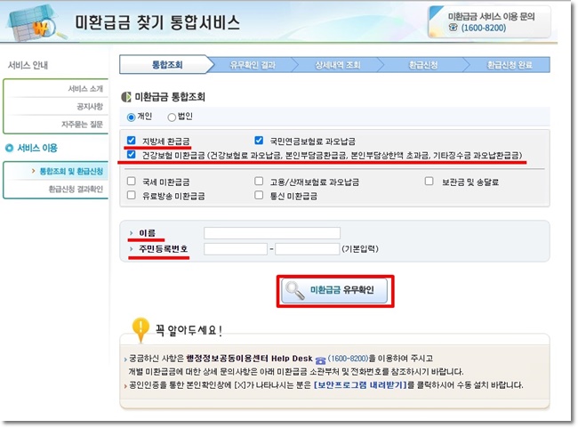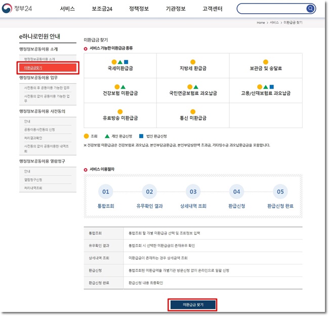왼쪽 목록에서 미환급금찾기를 선택하고 페이지 아래의 미환급금 찾기 버튼을 선택합니다.