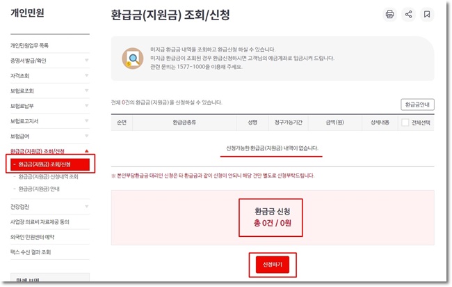 환급금 조회결과를 확인하고 환급금이 있는 경우 환급 신청할 수 있습니다.
