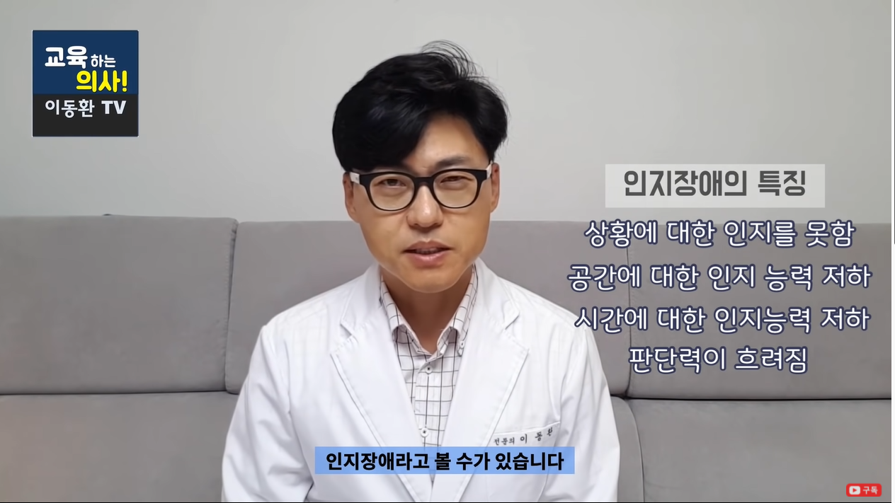 그러나 인지장애는 몇 월 며칠인지 떠올리지 못하거나 아침·저녁을 헷갈릴 정도의 상황과 공간의 인지능력이 떨어진 경우입니다.