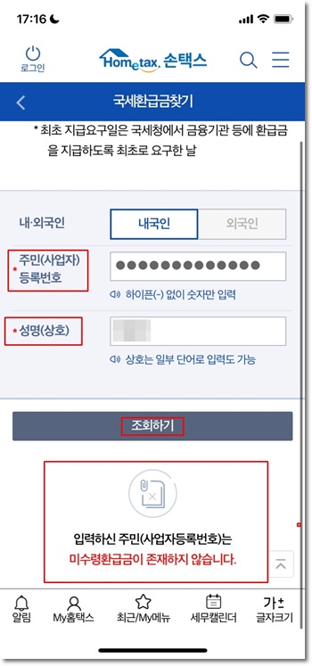 개인정보 등을 입력하고 조회하기를 터치하면 미수령 환급금을 찾을 수 있습니다.