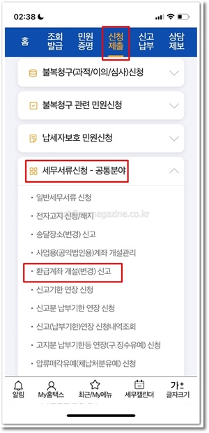 미수령액이 조회되는 경우 상단의 신청제출 메뉴에서 세무서류신청-공통분야를 클릭하고 환급계좌 개설(변견) 신고를 클릭하여 계좌번호 입력 후 신청하면 환급받을 수 있습니다.