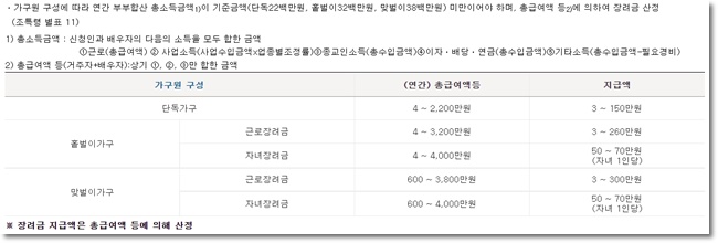 신청대상은 근로 소득 등이 있는 가구로서, 가구구성원에 따라 총소득요건, 재산요건 등을 아래에서 설명하는 요건을 모두 충족하는 경우에 신청 대상이 됩니다.