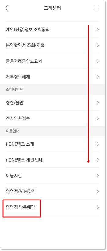 앱 실행 후 첫 화면에서 전체메뉴 ☞ 고객센터 ☞ 맨 아래 영업점 방문예약을 선택합니다.