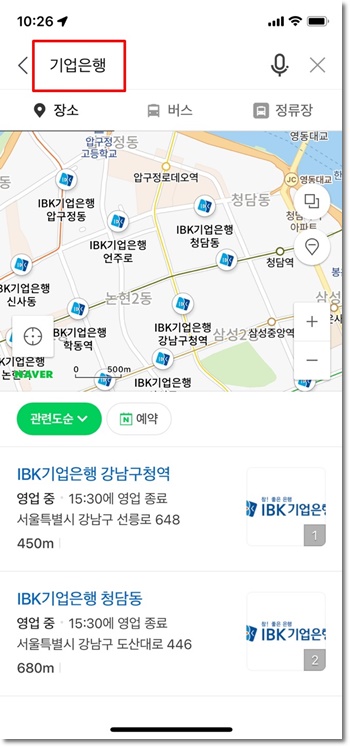 네이버지도 앱을 실행하여 방문하려고 하는 지역의 기업은행을 검색합니다.