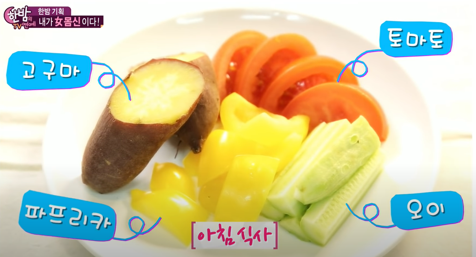 박보람은 아침에 고구마와 토마토, 오이, 파프리카 등 야채로 구성된 식단을 먹는다고 하는데요.