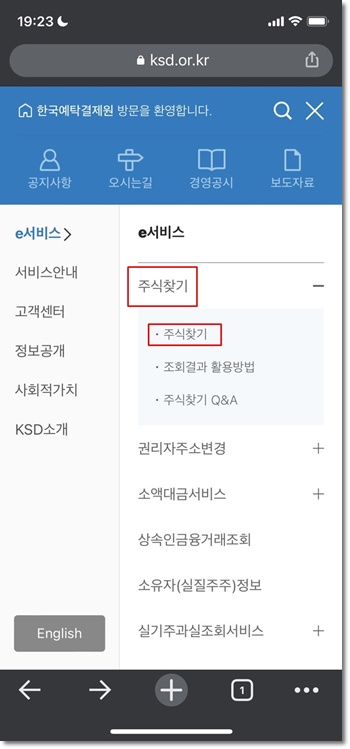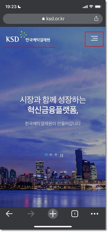 공식사이트인 한국예탁결제원 사이트에 접속 후 우측 상단 메뉴 클릭합니다.