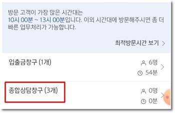 방문지점의 대기고객과 예상시간을 확인하고 방문할 창구를 선택하면 번호표가 발급됩니다.