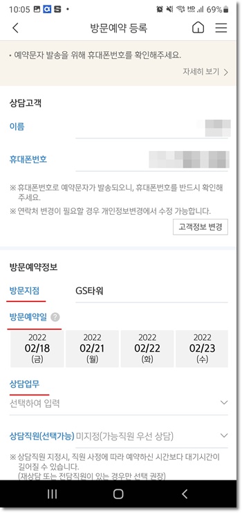 방문지점 검색 및 선택, 예약일자, 예약시간, 상담 업무 등을 선택합니다.
