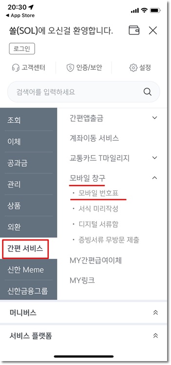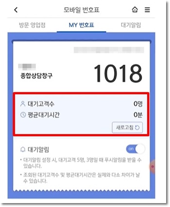 간편서비스 메뉴에서 모바일 창구 속 모바일 번호표 메뉴를 선택합니다.