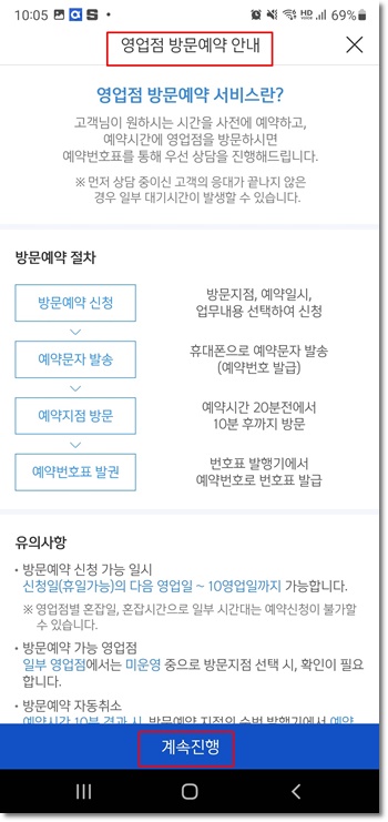 영업점 방문예약 안내사항을 확인 후 계속진행합니다.