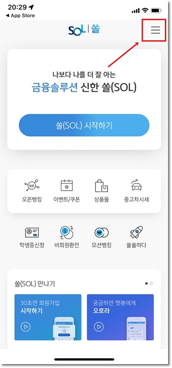 신한은행 공식 앱 SOL을 실행하고 오른쪽 위 메뉴를 선택합니다.