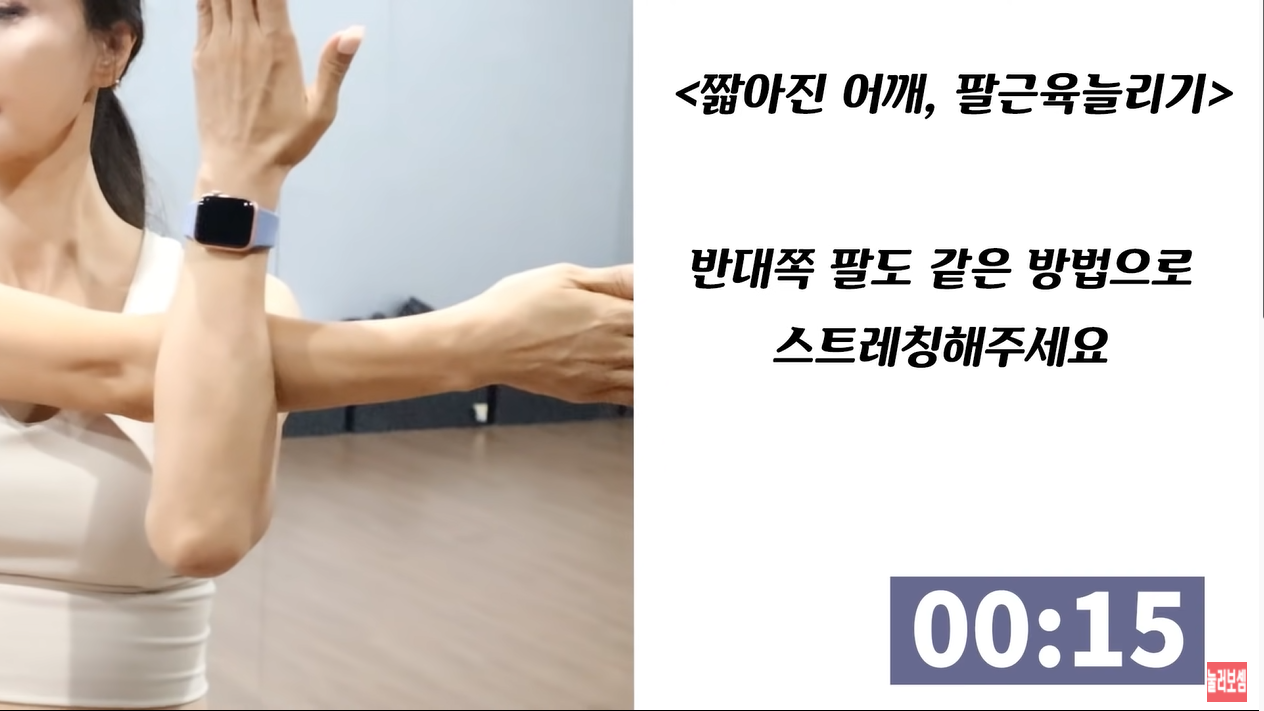 한 쪽 팔을 쭉 펴고 반대쪽 팔로 고정시켜 몸 쪽으로 당기면서 근육을 서서히 늘려줍니다. 이때 어깨는 최대한 아래로 내려야 하며 양 팔을 번갈아 가면서 15초씩 진행해 주면 됩니다.