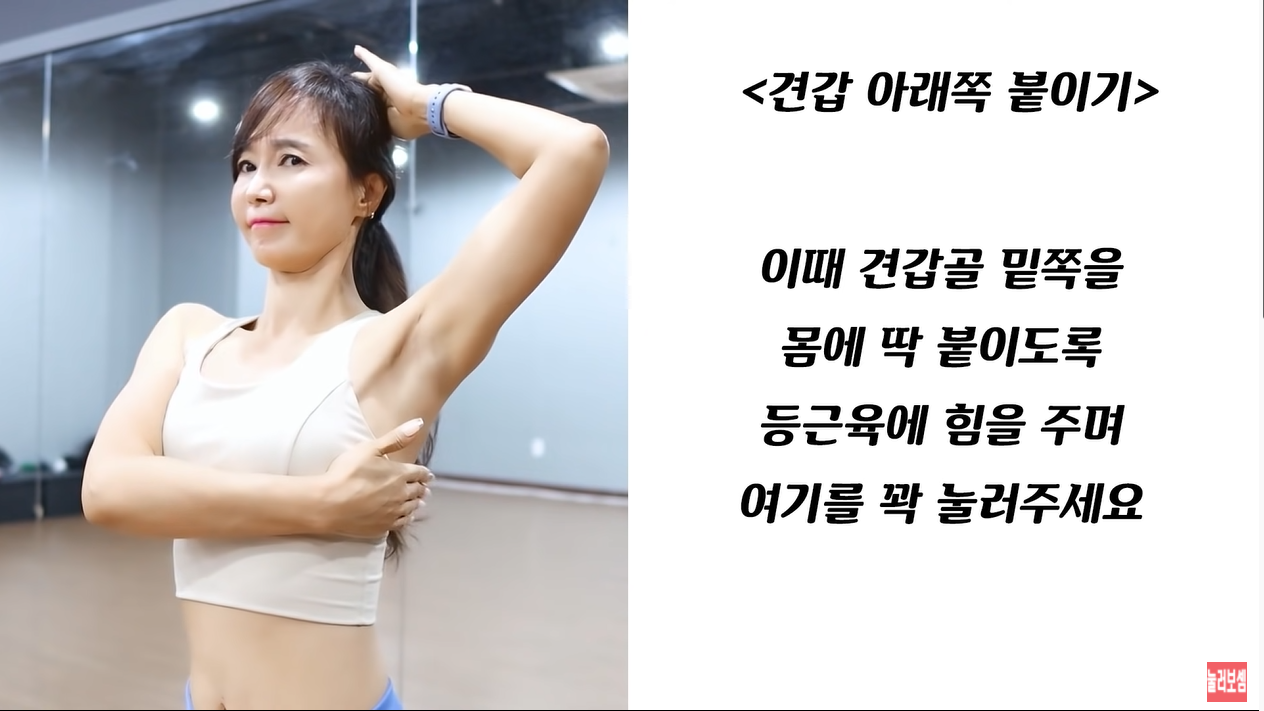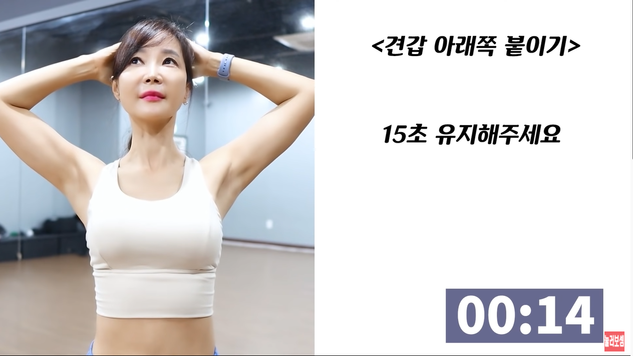 마지막으로 두 번째 자세에서 숨을 들이마시고 어깨는 아래로 내려서 고정시켜줍니다. 양 손을 머리 뒤 쪽에 얹은 채로 계속해서 어깨를 아래로 끌어내려주며 15초를 유지합니다.