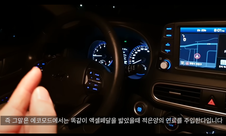 에코모드는 일반 주행모드와 다르게 컨트롤이 달라집니다. 이렇게 설계된 이유는 에코모드를 켜는 경우 최소한의 연료를 이용하기 때문에 연료분사량이 줄어듭니다.