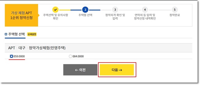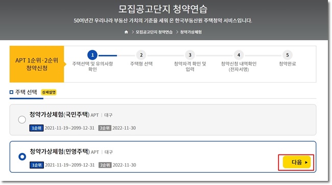 한국부동산원 청약Home에서는 청약 가상체험을 제공하고 있습니다. 청약정보를 사전에 제공하여 청약신청내역의 오기를 예방할 수 있도록 지원하는 서비스로써, 실제 청약과 똑같이 청약자격 및 입주자선정기준에 맞는지 확인해 볼 수 있는 서비스입니다.