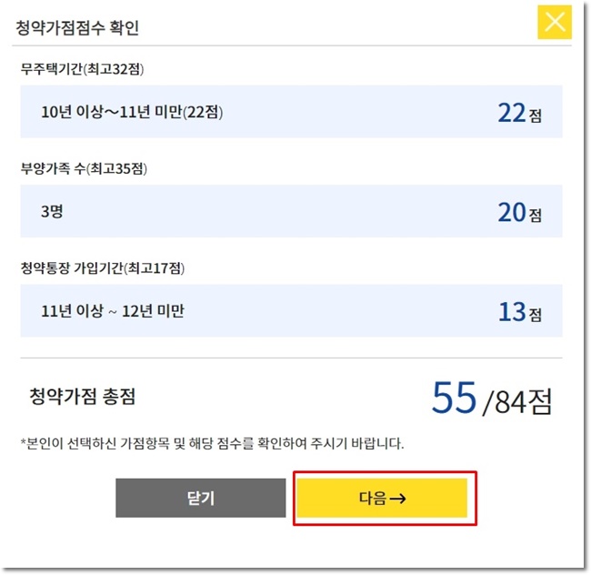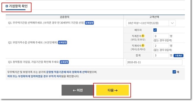 거주지, 선정기준, 가점항목 등을 선택 및 입력하여 실제 본인의 점수와 자격을 확인합니다.