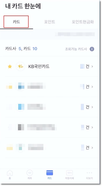 상단 카드 탭을 터치 시 보유한 카드를 일괄조회 할 수 있습니다.