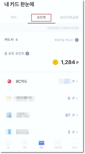 상단 포인트 탭을 터치 시 보유한 포인트를 일괄조회 할 수 있습니다.