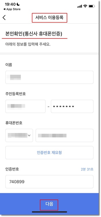 서비스를 이용하기 위해 서비스 이용등록 및 본인인증 절차를 진행합니다.