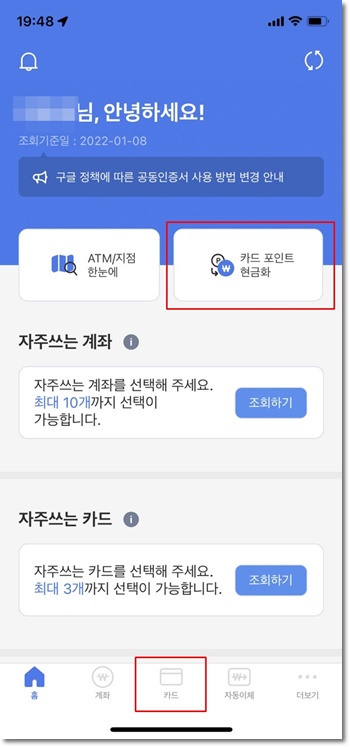 상단의 ‘카드 포인트 현금화’ 또는 하단의 ‘카드’를 터치합니다.
