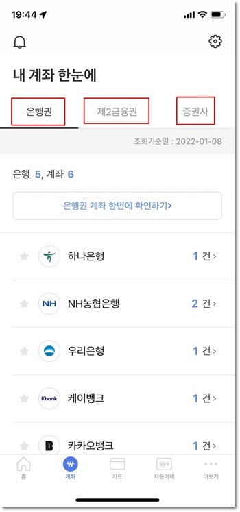 하단의 계좌 메뉴를 들어가면 은행권, 제2금융권, 증권사 계좌를 모두 확인할 수 있습니다.