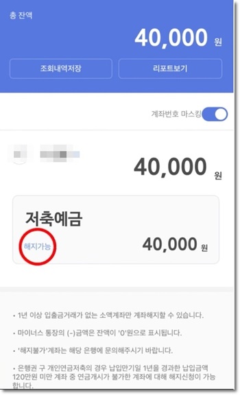 계좌목록 중 안 쓰는 계좌를 터치하여 ‘해지가능’이 표시된 경우 계좌해지 신청을 통해 은행 영업점 방문 없이 해지가능 합니다.