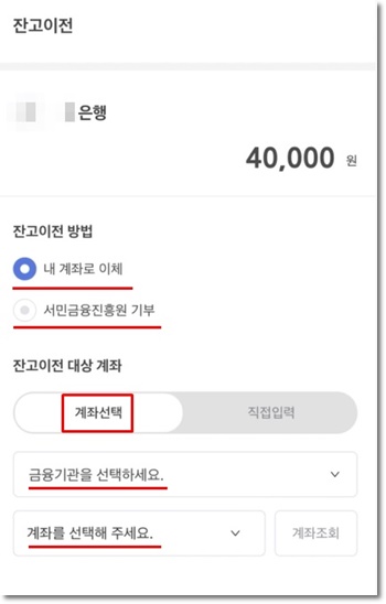 계좌해지서비스 이용 동의 후 내 계좌로 이체하거나 서민금융진흥원에 기부할 수도 있습니다.
