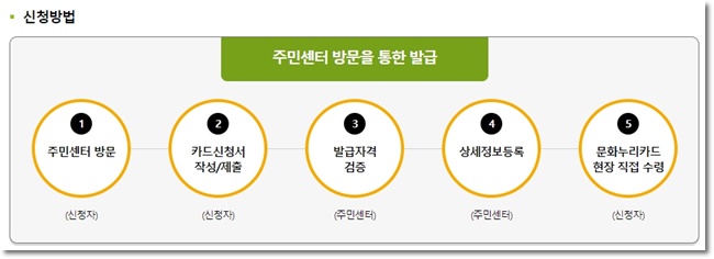 오프라인 신청방법은 가까운 주민센터 방문하여 카드신청서 작성 및 제출 후 지원대상자에 해당하지는 여부를 확인하고 현장에서 직접 수령할 수 있습니다.
