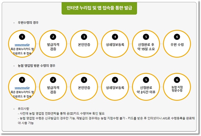 온라인신청은 인터넷 홈페이지(문화누리 바로가기)를 통한 신청과 모바일 어플리케이션을 다운 받아 신청하는 방법이 있으며, 신청 후 우편으로 받는 방법과 직접 방문수령하는 방법이 있습니다.