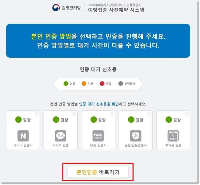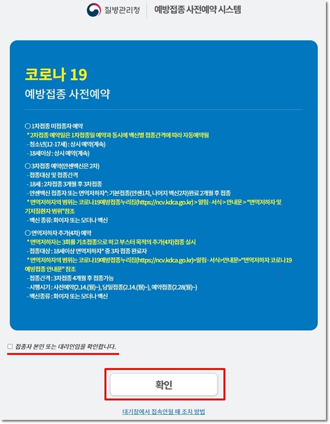 질병관리청 공식 예약시스템인 사전예약 홈페이지 접속