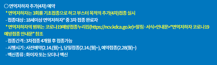 4차 백신접종은 접종을 희망하는 자에 한하여 이루어지며, 3차 접종을 완료하고 120일이 지난 사람이어야 가능합니다. 단, 집단감염 등의 위험에 노출되어있으면 3차 접종이후 90일 지난 사람도 접종받을 수 있습니다.